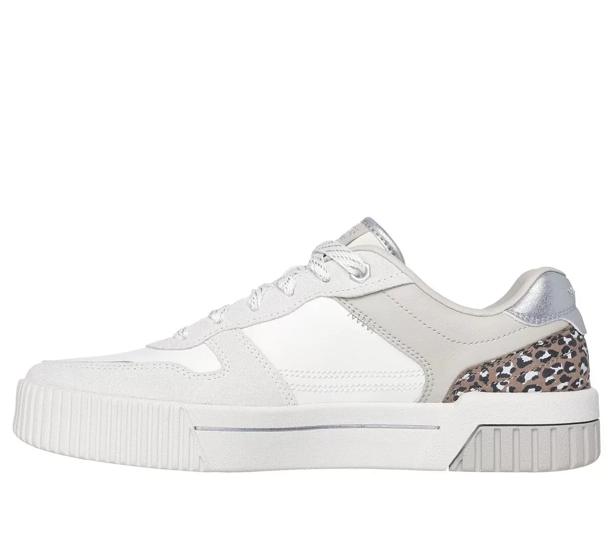 Disfruta de la comodidad perfecta en la cancha con las Skechers Jade – Lustrous Luxury. Estas zapatillas bajas con cordones presentan una parte superior de duraleather y gamuza, una talonera con estampado de leopardo, detalle de bigote metálico y una plantilla acolchada y cómoda registrada Skechers Air-Cooled Memory Foam®.