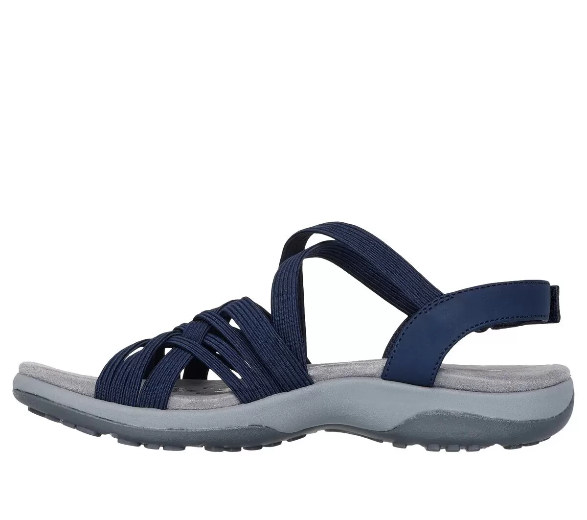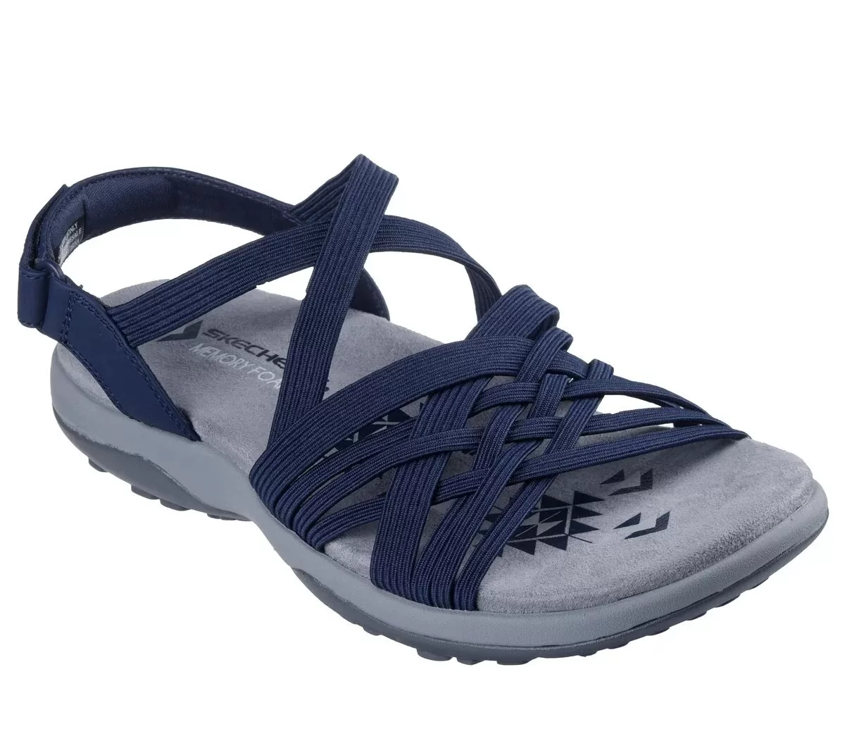 Haz que tu estilo y comodidad pasen desapercibidos con Skechers Reggae® Slim – Summertide. Esta sandalia presenta una parte superior de tela sintética y Stretch Fit® con una correa ajustable y una plantilla acolchada Skechers Memory Foam®.