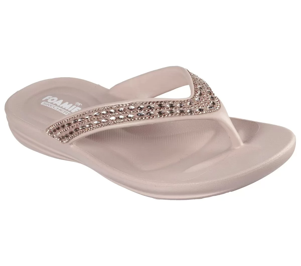 Dale vida a tu estilo veraniego con Skechers Foamies®: Glitzy. Esta sandalia informal de tiras esculpidas presenta una parte superior flexible de EVA con adornos de pedrería, además de una plantilla acolchada y contorneada.