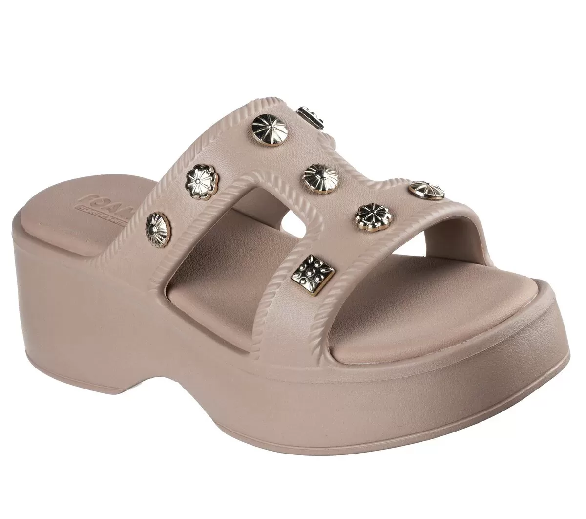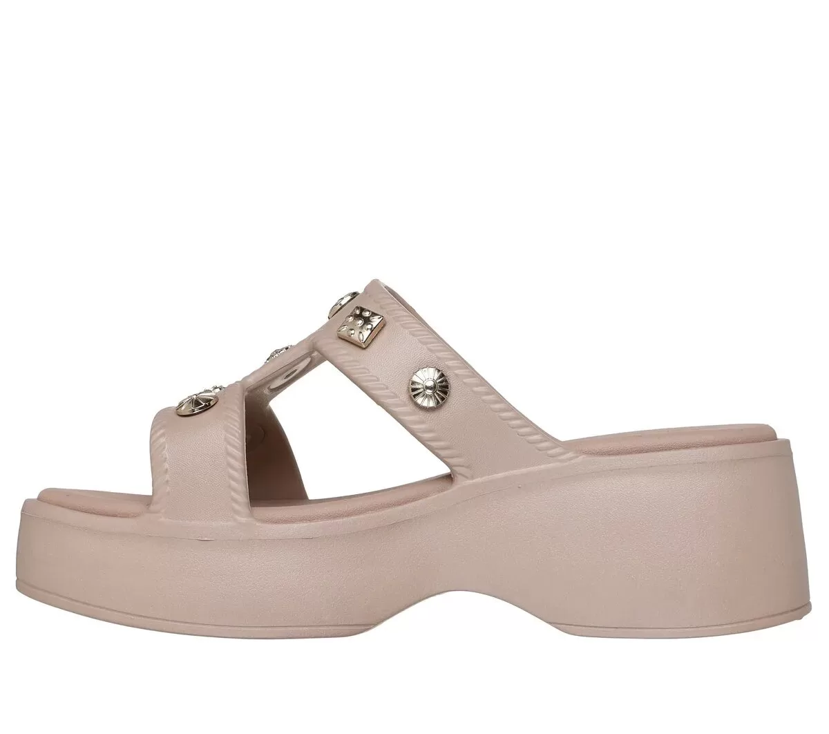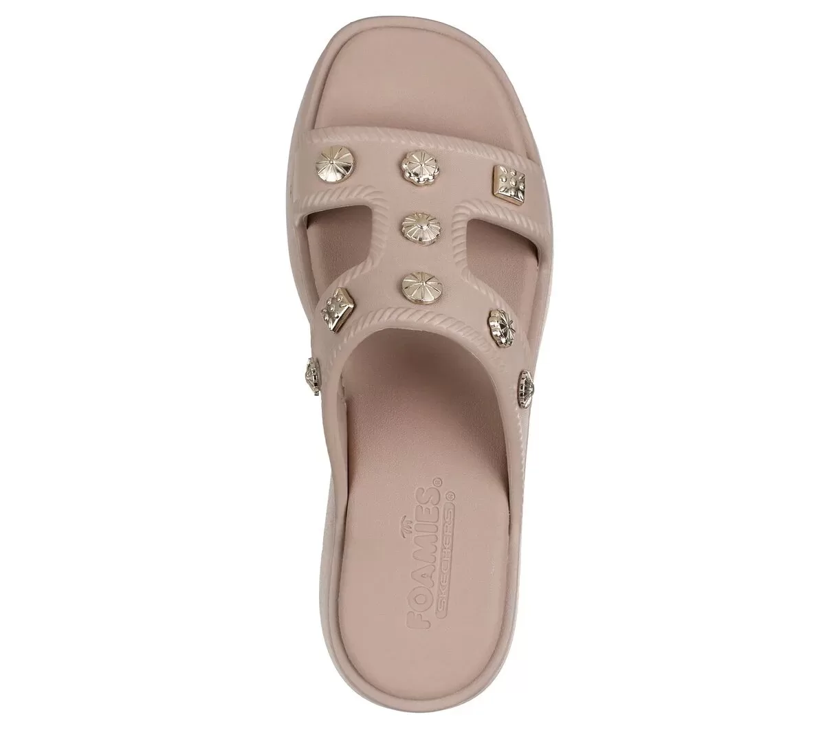 Dale un toque de estilo a tu look con las Skechers Foamies®: Rave – It-Girl. Estas sandalias de tira en T con diseño esculpido presentan una parte superior flexible de EVA Foamies® con plantilla acolchada, detalles metálicos decorativos y entresuela de plataforma.