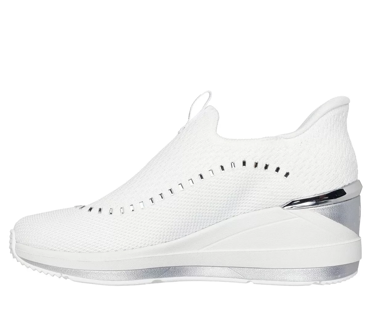 Sal con un estilo llamativo con Skechers Hands Free Slip-ins® Mark Nason®: The Triple Wedge – Clariti. Diseñadas con nuestra exclusiva Heel Pillow™, estas zapatillas de cuña alta de moda presentan una parte superior de punto con diamantes de imitación de corte esmeralda, un clip de talón de alto brillo, amortiguación de plantilla Memory Foam Lux y una entresuela con ribete brillante.