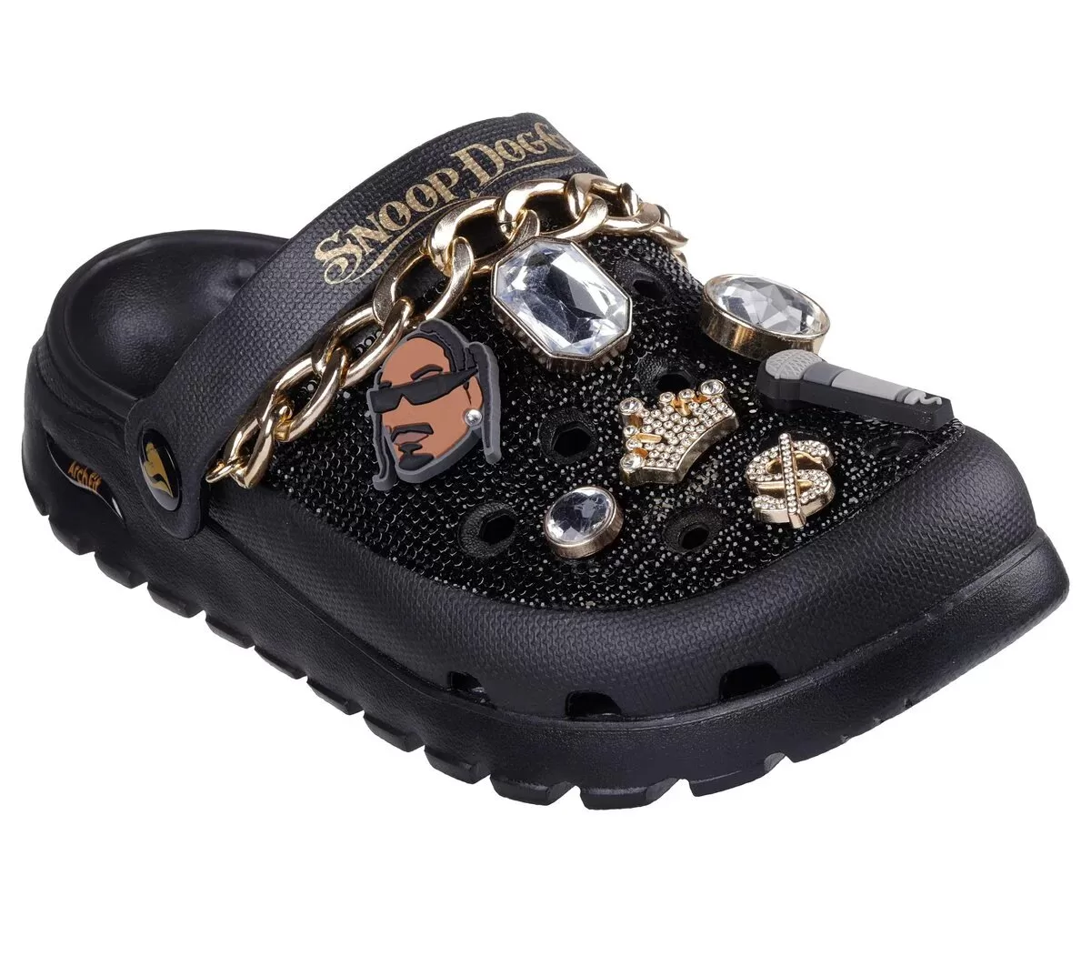 Haute Drop: Representa el D-O-Double-G con una comodidad glamorosa usando Skechers x Snoop Dogg: Arch Fit® Footsteps – Rolling N Gold. Este llamativo zueco de moda presenta una parte superior de EVA adornada con diamantes de imitación con detalle de cadena dorada, adornos extraíbles con temática de Snoop y una plantilla contorneada Arch Fit®.