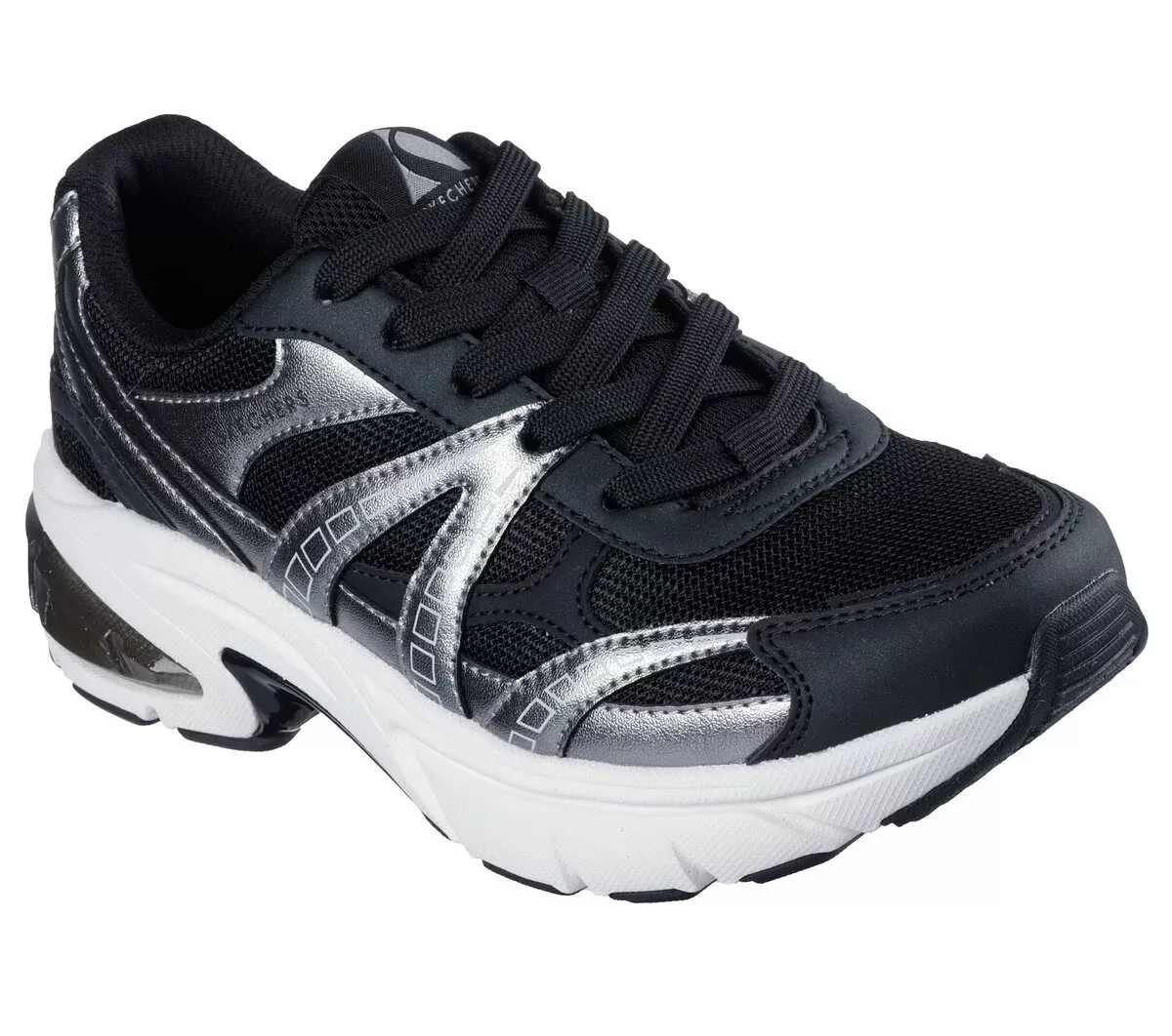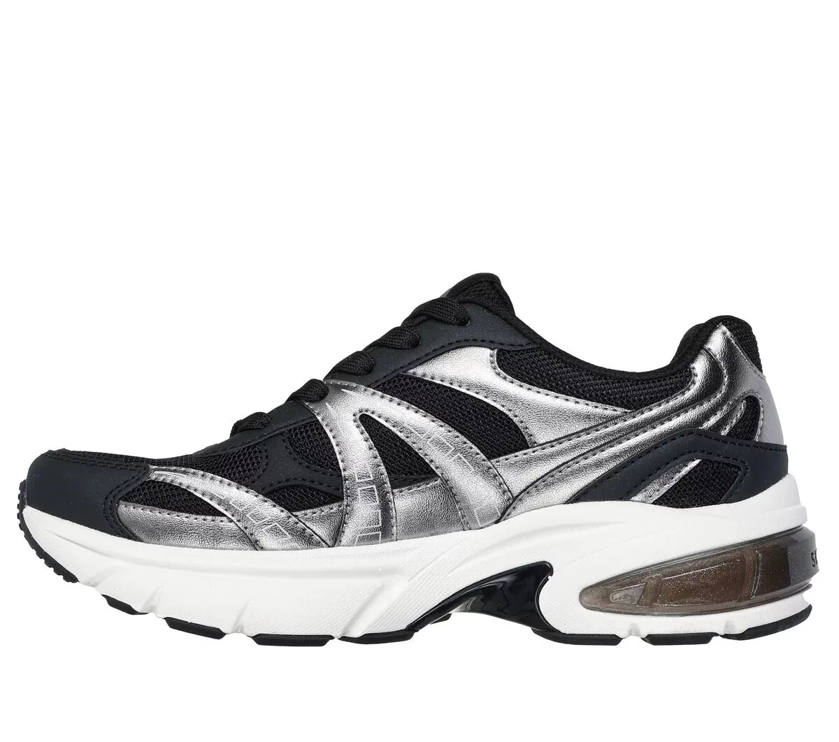 Muestra tu estilo deportivo de diva con las Skechers Street™ Skechers Shadow – Stellar 90. Estas zapatillas de moda con cordones cuentan con una parte superior de durapiel metálica y malla con una plantilla translúcida de entresuela y una plantilla acolchada Skechers Air-Cooled Memory Foam®.