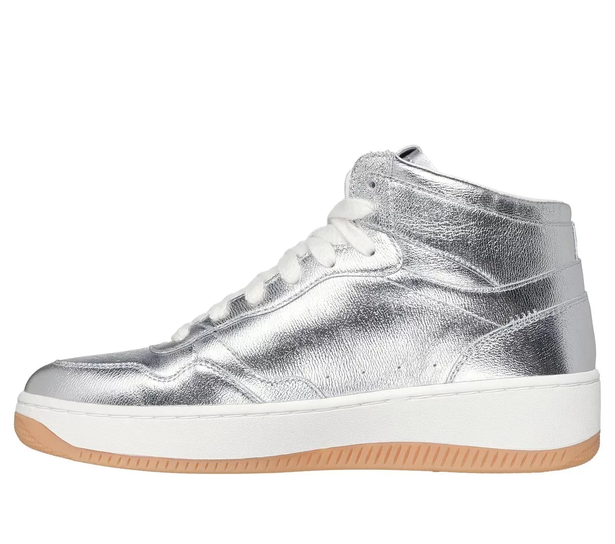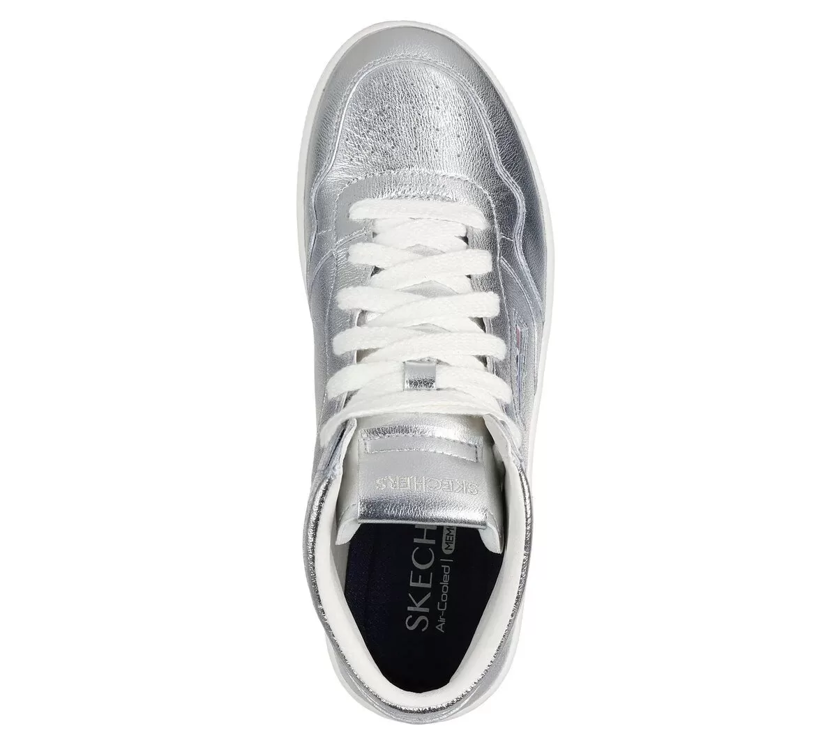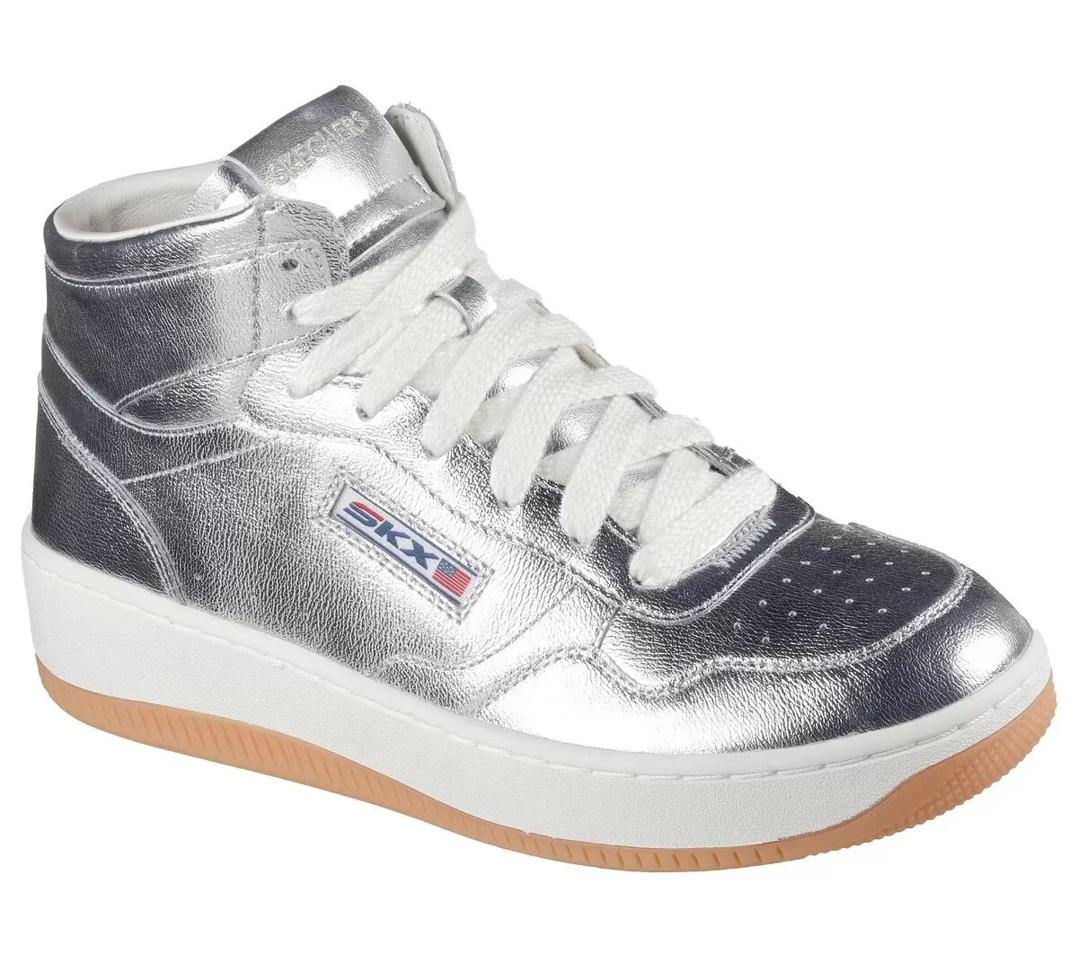 El estilo retro divertido y la comodidad se combinan en las Skechers Sport Court 2.0 – Shining Glory. Estas zapatillas altas con cordones, estilo cancha, presentan una parte superior de cuero con acabado metálico, complementada con una plantilla acolchada Skechers Air-Cooled Memory Foam®.