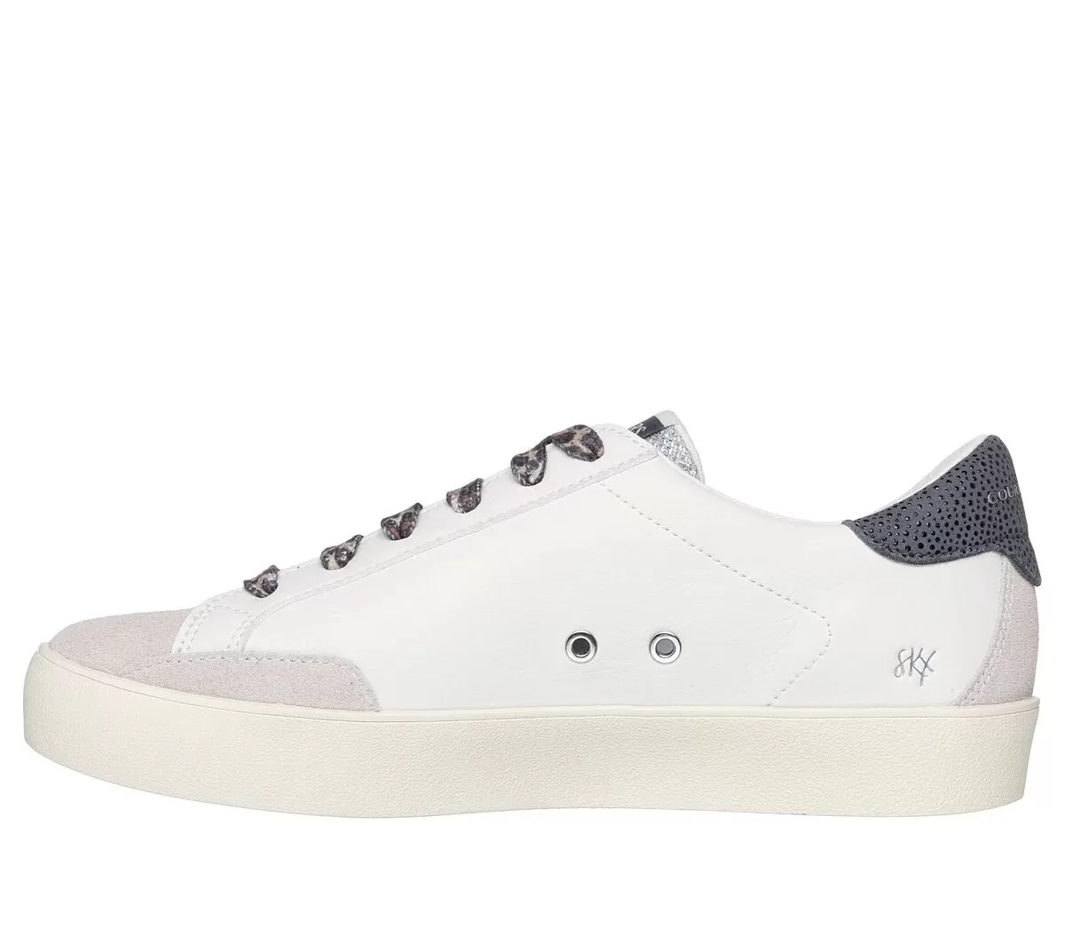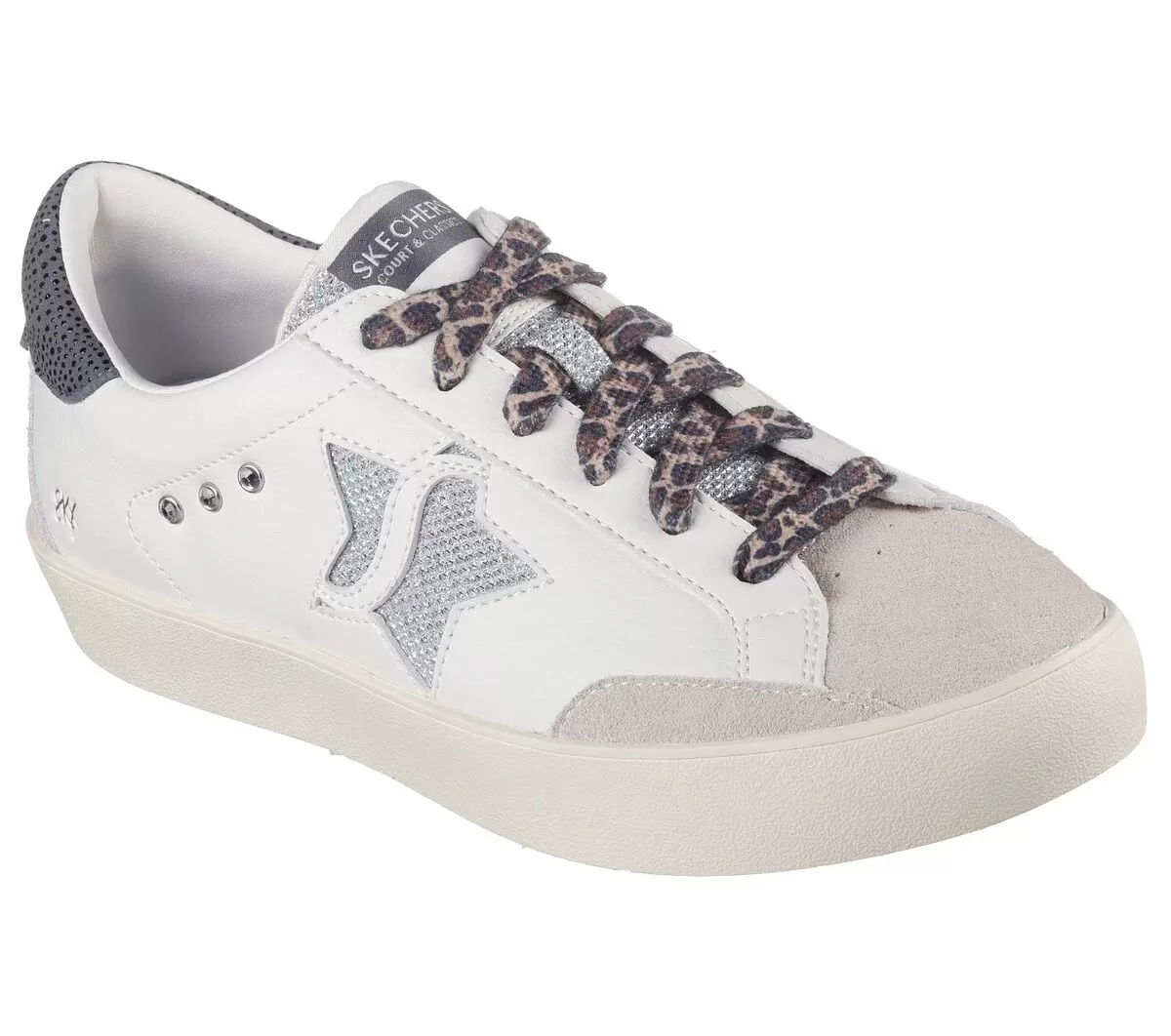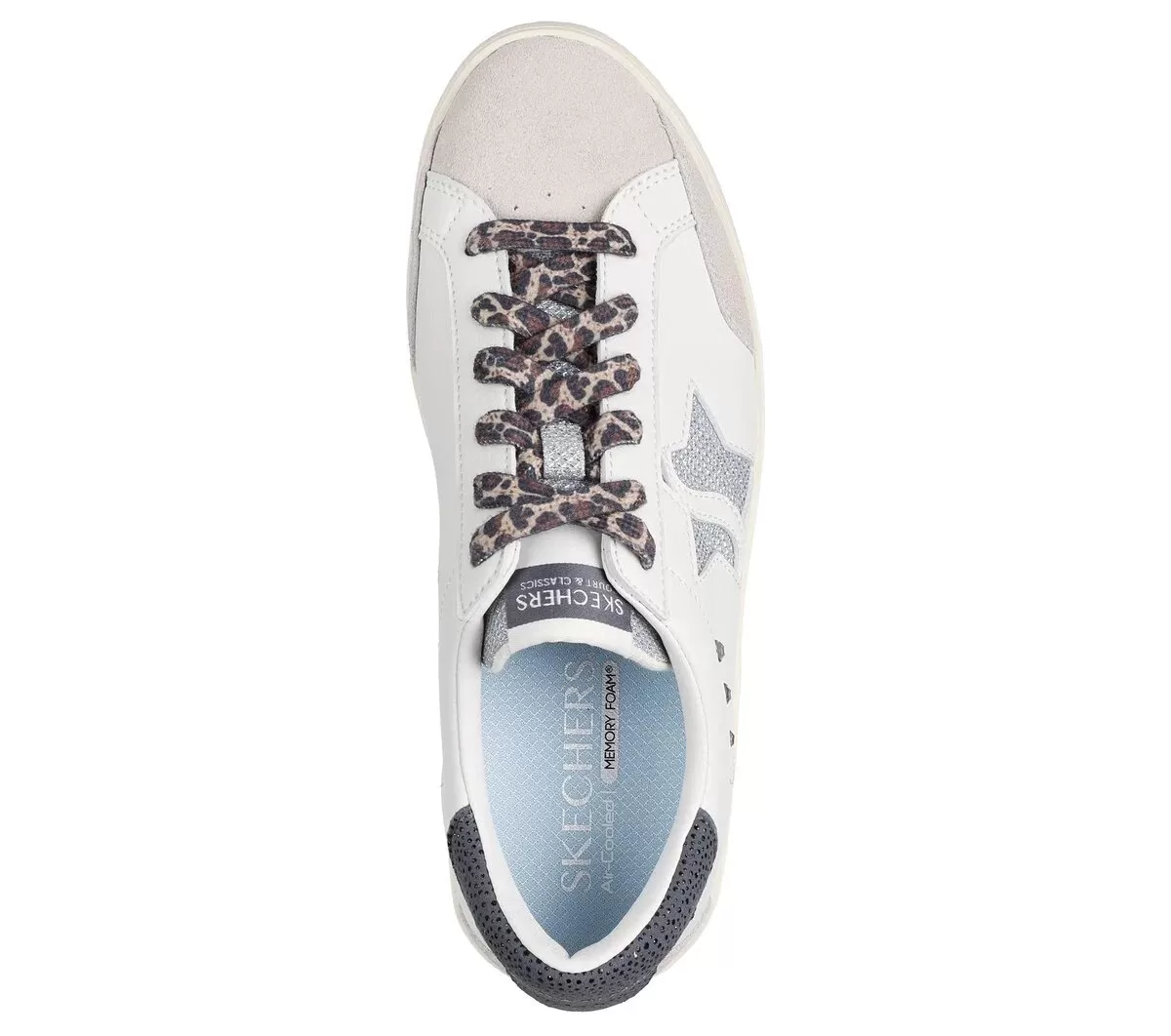 Encuentra tu estilo estrella con comodidad inigualable al usar Skechers Strand Star – Fierce Statement. Este zapato de caña baja con cordones y diseño moderno presenta una parte superior con una capa de duraleather y gamuza, detalles de estrellas y pedrería en los cuartos, una plantilla acolchada Skechers Air-Cooled Memory Foam® y una entresuela estilo cancha con cuña oculta en el talón.