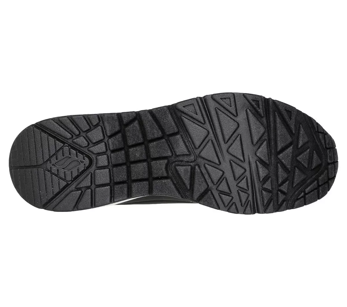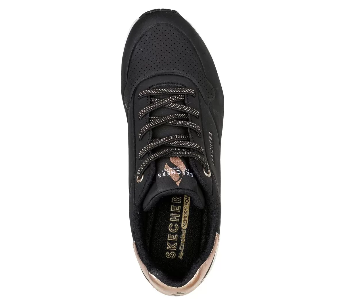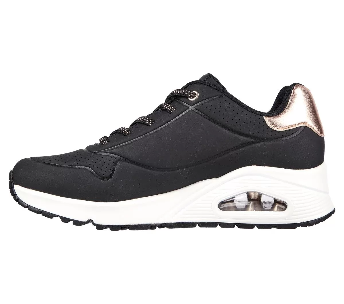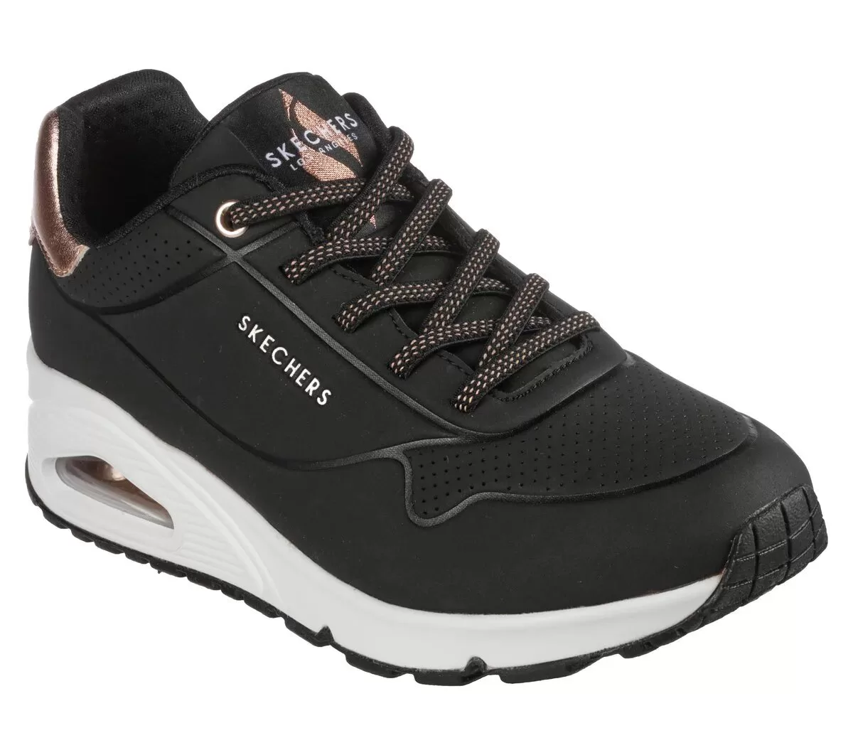 Disfruta de un estilo clásico esta temporada con Skechers Street™ Uno – Shimmer Away. Esta zapatilla deportiva de moda con cuña presenta una parte superior sintética de durabuck con ribete metálico en el talón, cordones elásticos, una plantilla Skechers Air-Cooled Memory Foam® y una entresuela con airbag visible Skech-Air®.