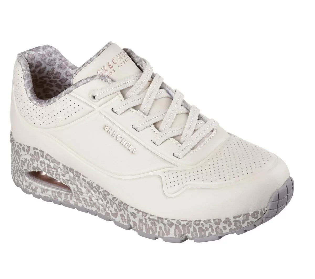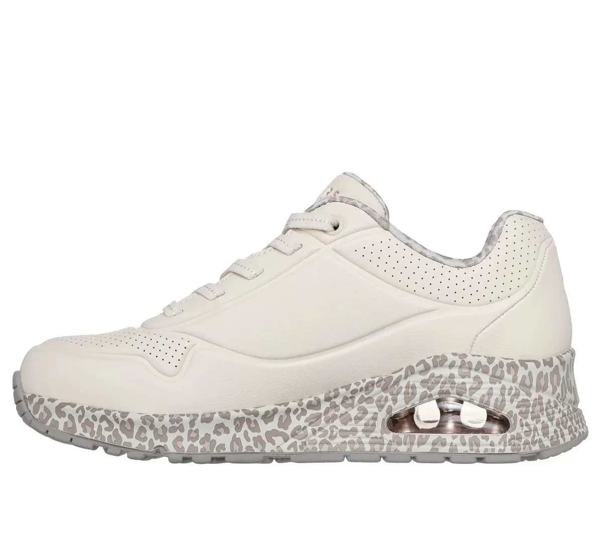 Camina sobre el aire con las comodísimas Skechers Street™ Uno – Safari Time. Esta zapatilla deportiva de moda con cordones elásticos presenta una parte superior de duraleather con un forro y una entresuela con estampado de leopardo, una plantilla Skechers Air-Cooled Memory Foam® y una entresuela visible con amortiguación de aire Skech-Air®.