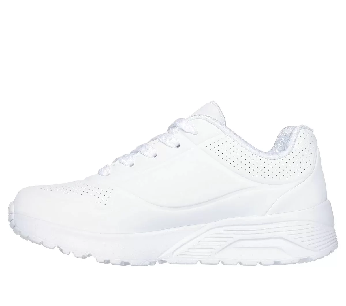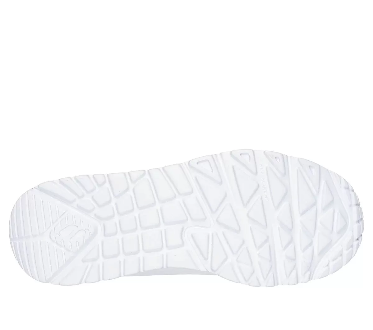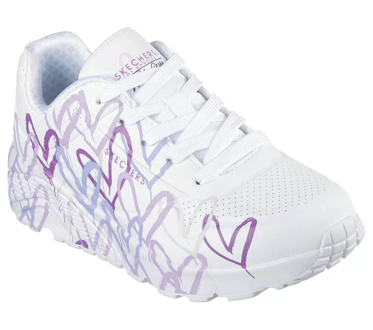 El muralista de renombre internacional James Goldcrown trae sus icónicos diseños de corazones #Lovewall a Skechers en esta inspiradora colaboración. Muestra tu estilo creativo con Skechers Street™ x JGoldcrown: Uno Lite – Comparte tu amor. Esta zapatilla deportiva de moda con cordones presenta un estampado del diseño de corazón característico del artista que se extiende hasta la suela exterior, una parte superior sintética de durabuck y perforada con una plantilla Skechers Air-Cooled Memory Foam®, además de una entresuela de plataforma con cuña.