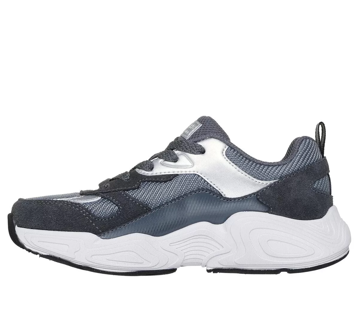 Revoluciona tu juego con Skecher Street™: Mega-Quake – Shadow Surge. Este diseño ligero con cordones presenta una parte superior de malla con capas superpuestas de gamuza sintética y genuina, una entresuela bien acolchada con detalles de contorno y una plantilla Skechers Air-Cooled Memory Foam®.