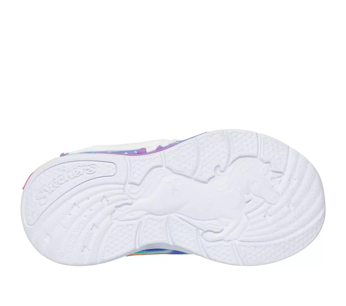 Brilla con estilo con las Skechers S-Lights® Unicorn Chaser. Este diseño deportivo iluminado de la Colección Magical® presenta una parte superior sintética con acabado brillante y un gráfico lateral de unicornio y arcoíris, cordones elásticos, correa ajustable en el empeine y una plantilla acolchada y cómoda. Regalo adicional con la compra.