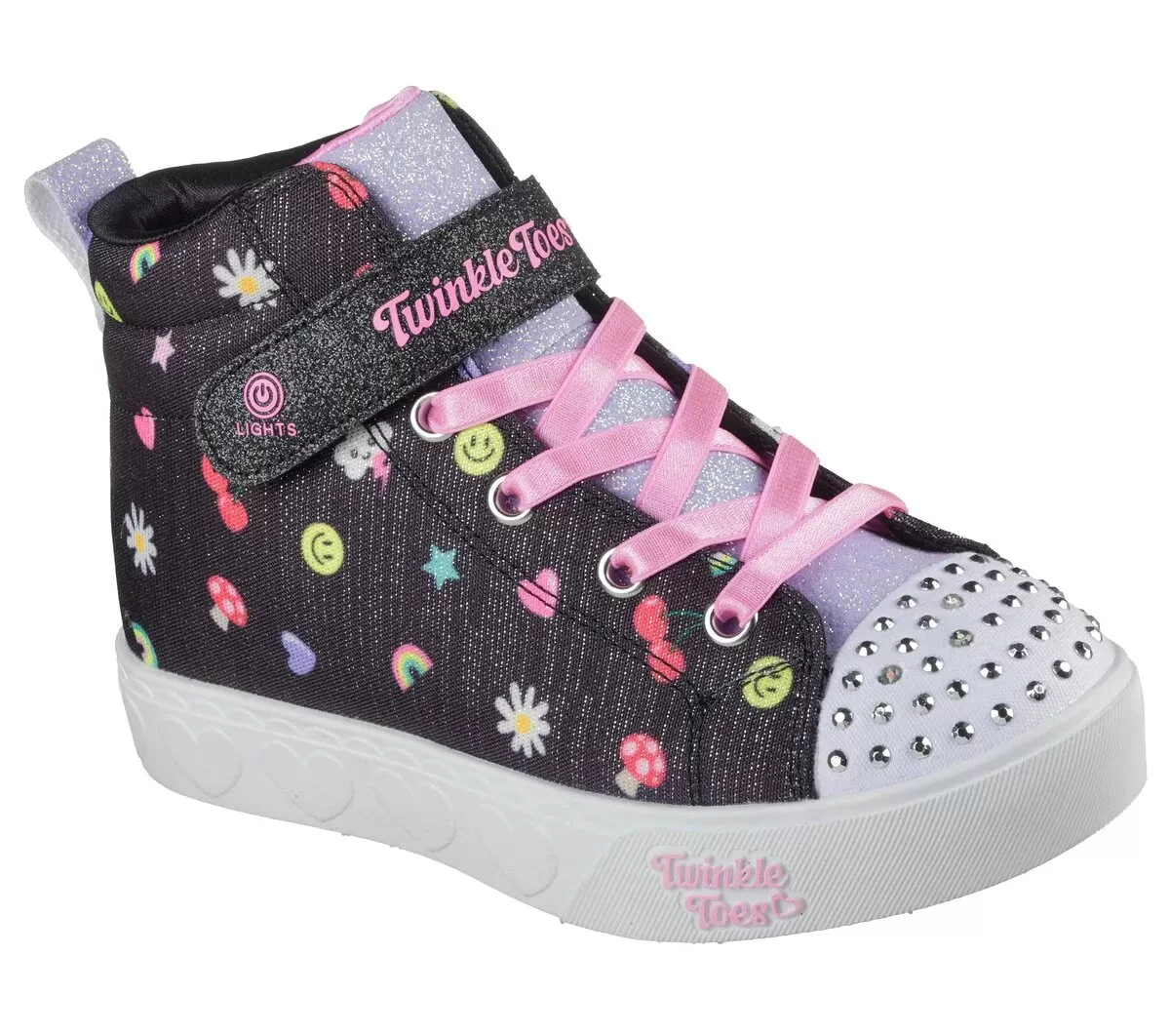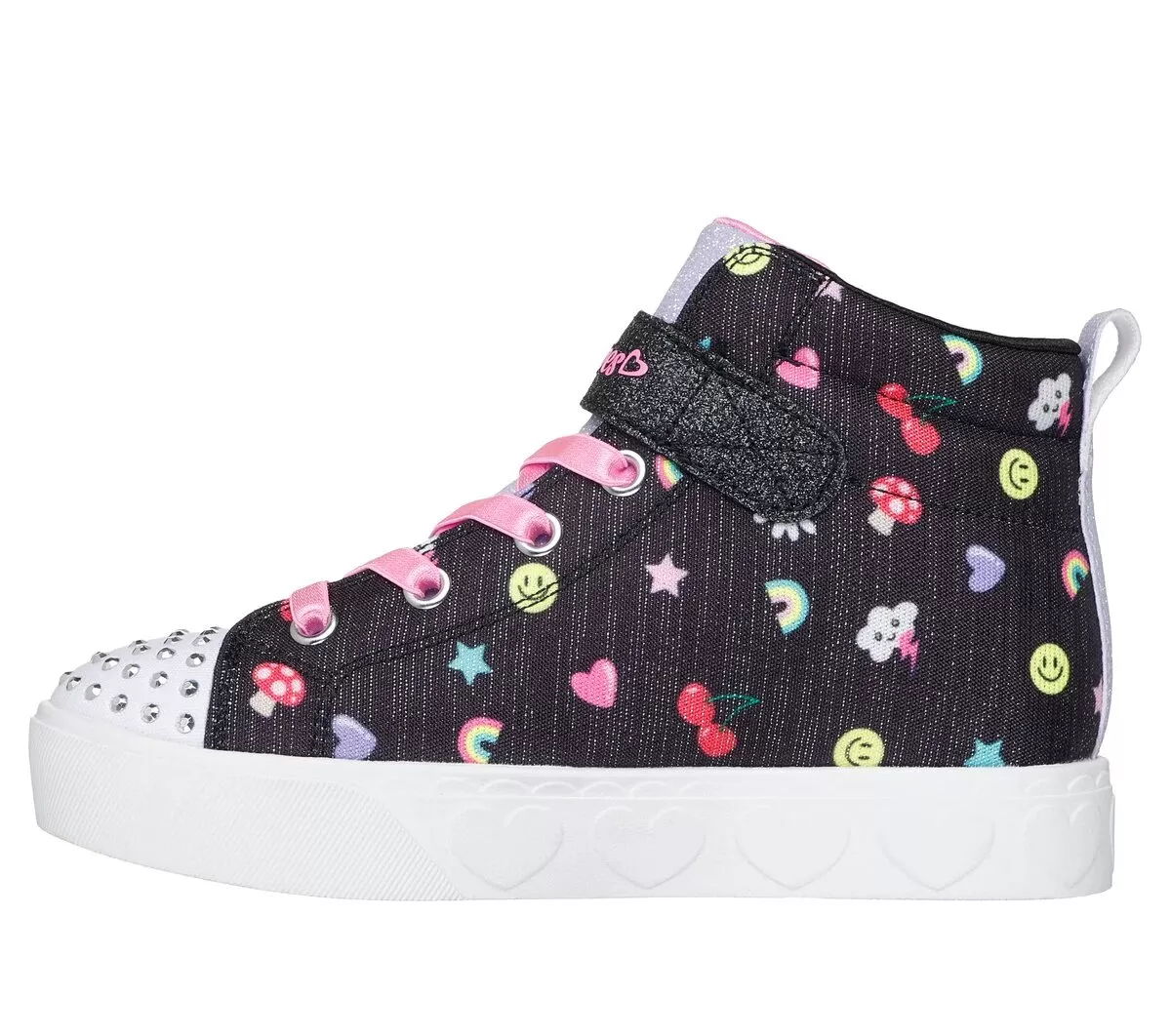 Ilumina cada habitación con un estilo brillante con Skechers Twinkle Toes®: Heart Steps – Icon Party. Esta zapatilla deportiva de caña alta presenta una parte superior brillante con un divertido microestampado, cordones elásticos, una correa ajustable en el empeine y una puntera iluminada adornada con diamantes de imitación.